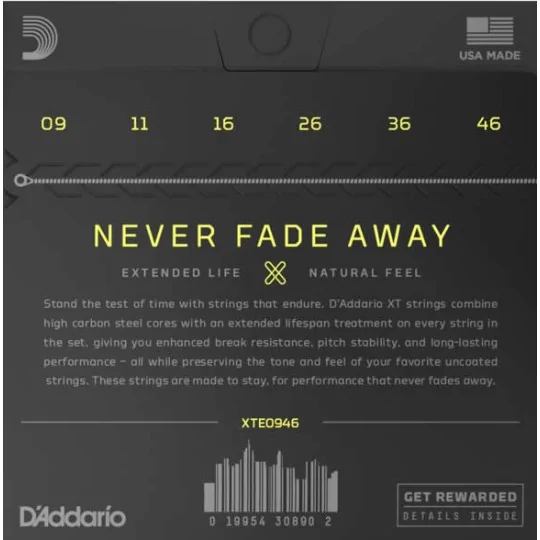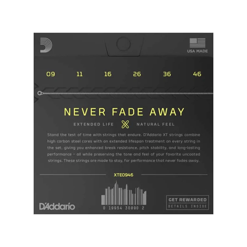 Les cordes D'Addario XTE0946 sont conçues pour offrir une résistance accrue à la casse, une meilleure stabilité de l'accordage et une durée de vie prolongée par rapport aux cordes électriques standards. Grâce à leur revêtement XT, appliqué sur chaque corde du jeu, elles bénéficient d’une protection avancée contre la corrosion, tout en conservant un toucher naturel et une sonorité brillante, comparable à celle des cordes non revêtues.
