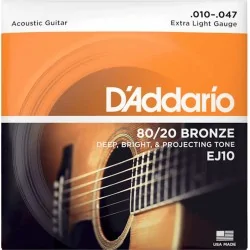 Les cordes D'Addario EJ10 (80/20 Bronze, Extra Light) offrent un son brillant et des harmoniques riches grâce à leur alliage de haute qualité. Faciles à jouer et durables, elles sont idéales pour les guitaristes cherchant une tonalité éclatante et une grande fluidité de jeu.