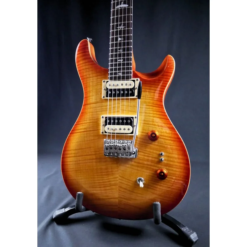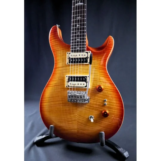 SE Custom 24-08 Vintage Sunburst en excellent état. Top érable flammé, corps acajou, manche large et mince en érable, touche palissandre 24 frettes avec incrustations oiseaux. Contrôles volume/tonalité à pression/traction, sélecteur 3 positions, chevalet PRS Tremolo, mécaniques PRS, accastillage nickel. Equipée de cordes neuves et housse PRS SE incluses. Vérifiée et réglée par notre luthier, prête à jouer.